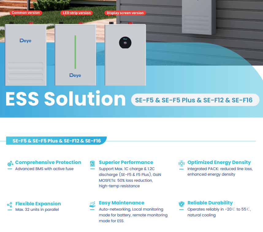 The Deye SE-F5 Battery is a premium lithium iron phosphate (LiFePO₄) energy storage unit engineered for residential and commercial energy systems. With a nominal capacity of 5.12kWh and 51.2V, it delivers reliable performance, advanced safety features, and flexible scalability.