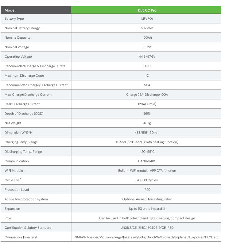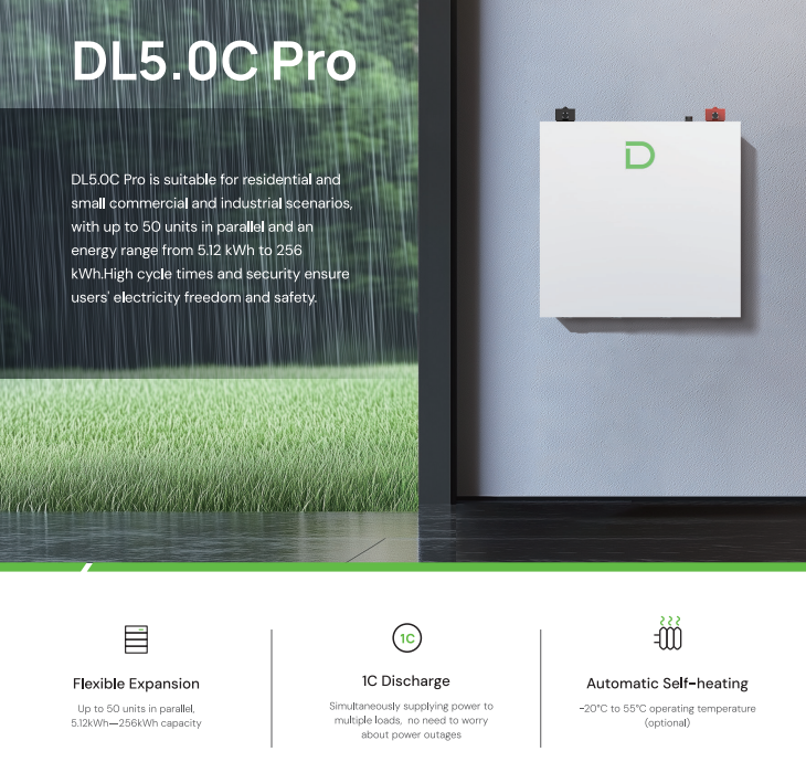 The DL5.OC Pro is suitable for residential and small commercial and industrial scenarios, with up to 50 units in parallel and an energy range from 5.12 kWh to 256 kWh.High cycle times and security ensure users' electricity freedom and safety.