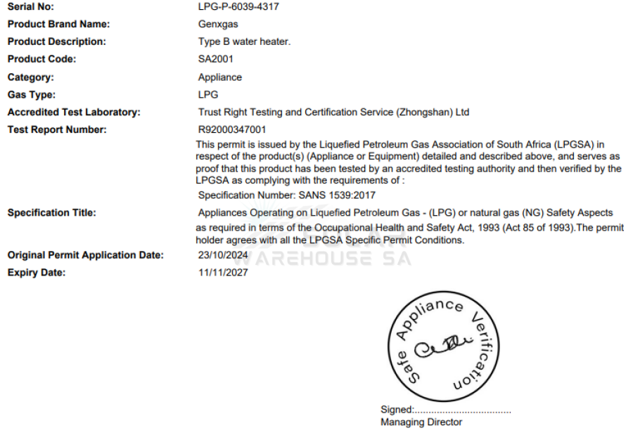 • Type: Gas Water Heater